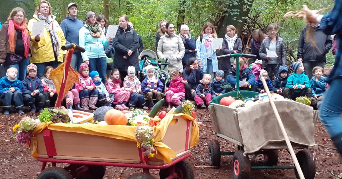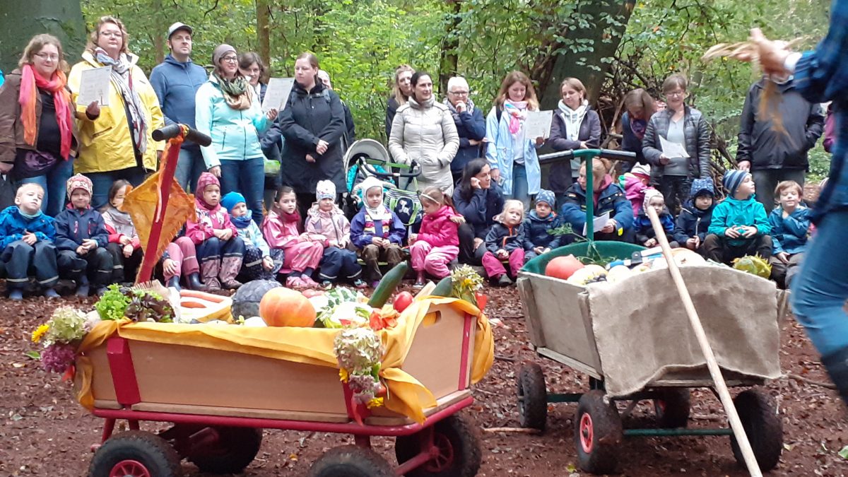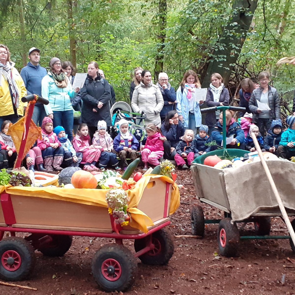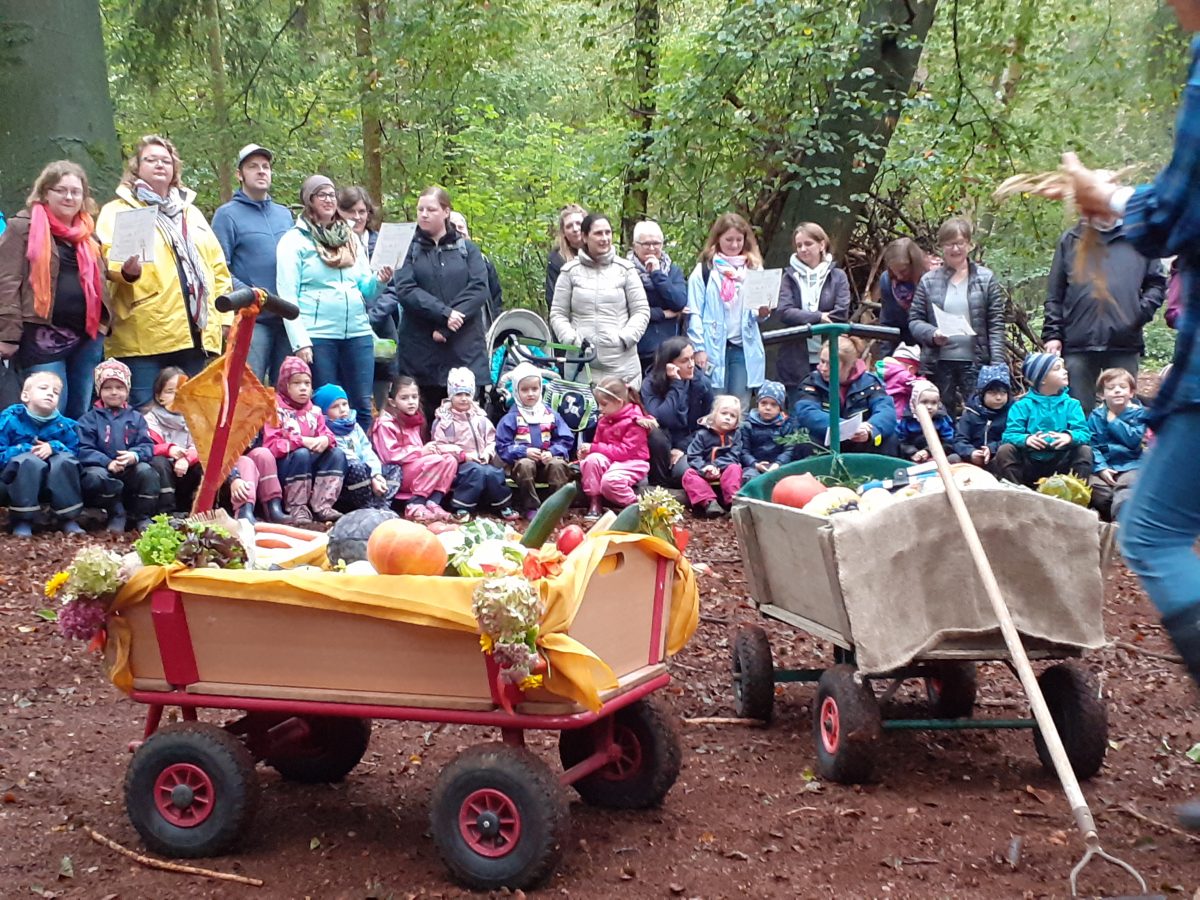 „Den ganzen Tag lang, machst Du uns Geschenke…“ – wenn im Wald an die 100 Kinder dieses Lied singen, dann wissen alle Waldtiere dort Bescheid: Es ist Erntedankfestzeit. Zusammen mit ihren Eltern feierten die Kindergartenkinder der Christuskirche ihren Erntedankgottesdienst, wie immer mit Besuch und 2 prall gefüllten Erntewagen. Voller stolz präsentierte Bauer Klaus (gespielt von Nina Strehl) seine Produkte und machte auf die Leitung seiner Wenigkeit aufmerksam. Ein zufällig vorbeifliegender Rabe rückte es dann aber alles wieder zurecht: Die Leistung des Bauern sei das eine – jedoch Sonne, Regen, Beschaffenheit des Bodens und das Wetter sei das andere, wo jawohl auch Gott seinen Einfluss hätte.