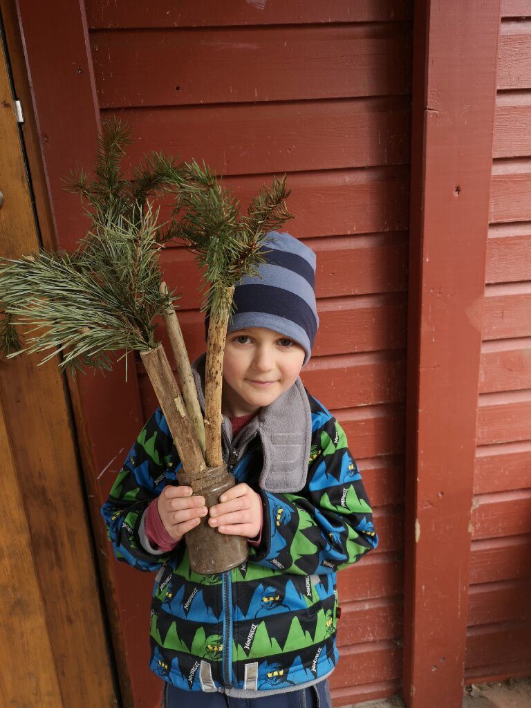 Im Waldkindergarten wurden „Palmen“ hergestellt. Da in unseren Breiten ja nicht echte Palmen verfügbar sind, wussten sich die Waldkinder selber zu helfen. Aus sehr weichem Holunderstamm und den Resten einer gefällten Douglasie stellten sie Palmenwedel her – passend zu dieser Zeit und in Erinnerung an den Palmsonntag vor Ostern.