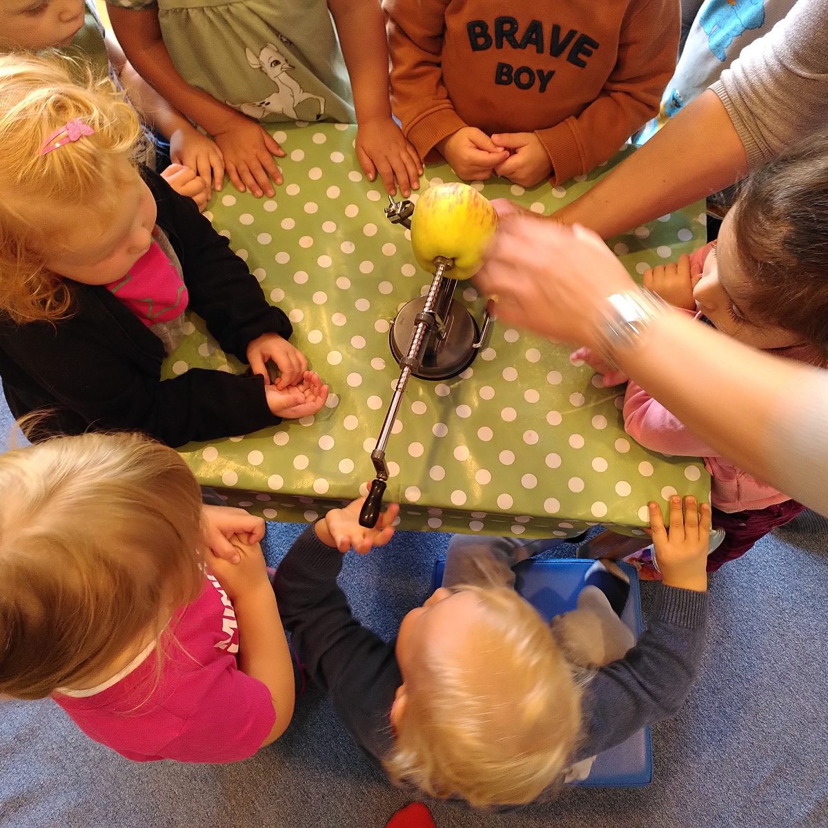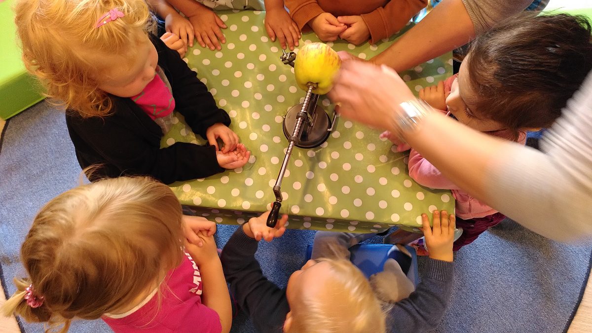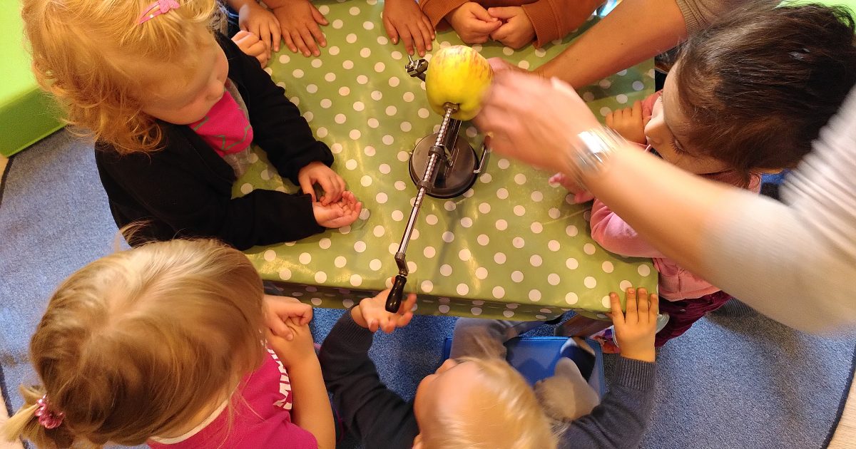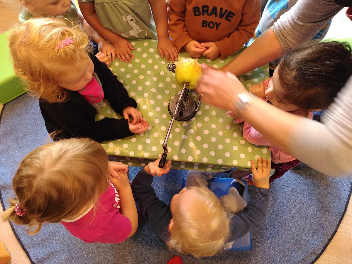 Wer kennt sie noch? Im Spatzennest konnten unsere Jüngsten ihre Äpfel mit dieser Maschine zubereiten: Mit der Handkurbel wurde die Schale entfernt – ein Spaß für alle!